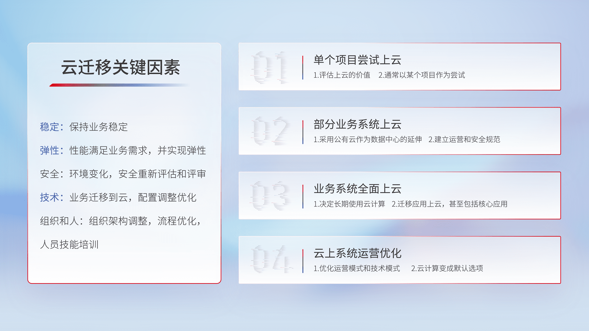 结合实际业务,,,从规划设计、、、云平台选型、、云原生改造、、、、数据迁移、、集成交付,,迁移全过程为客户识别最佳上云路径,,,做好风险识别管理,,设计网络架构、、、、身份权限、、、、安全审计合规、、操作审计、、、、日志审计、、监控告警策略、、、、多站点容灾设计等,,,,对云上基础设施进行整体规划,,提升IT治理水平,,,以满足弹性、、、、高可用、、、高性能的需求。。