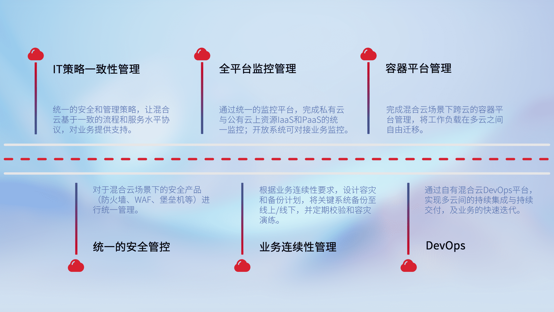 通过多云纳管,,,,以统一的资源数据模型把客户的云资源进行抽象和封装,,,进而实现对多云资源的统一操作,,,保障云资源管理的可靠性、、、、稳定性与可用性。。量身定制化运维内容,,,,配置、、、开发运维、、、补丁管理、、、备份、、、监控、、认证和访问管理、、审计和日常巡检等,,,,保障在用云过程中的可靠度,,稳定度以及高可用率。。。。