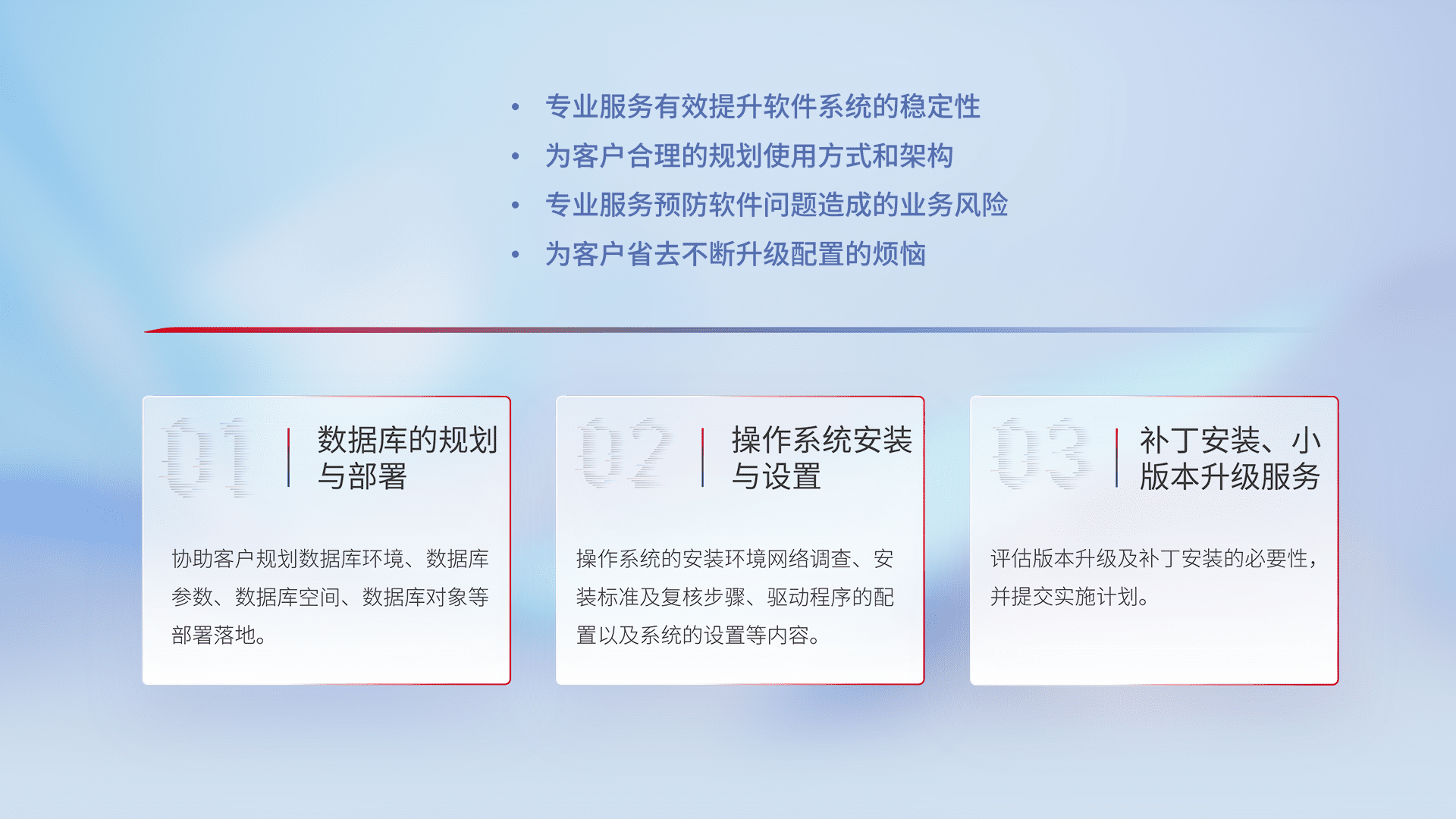 为客户提供软件规模升级、、快速部署、、按需配置的专业服务,,,,从数据库的规划与部署到操作系统的安装与设置,,,,再到补丁安装和小版本升级提供支持。。